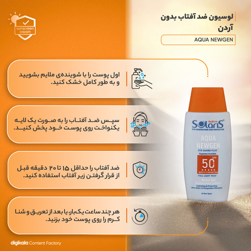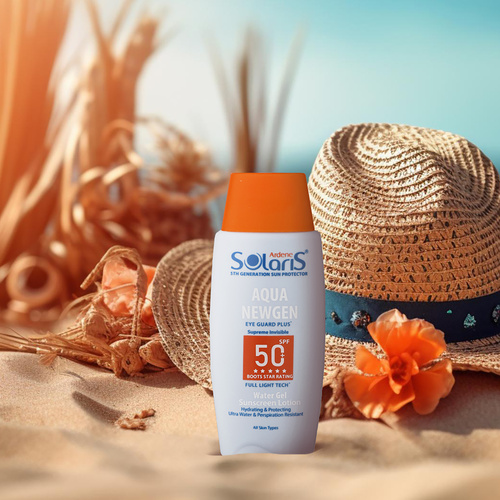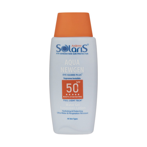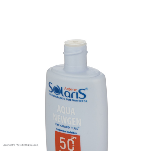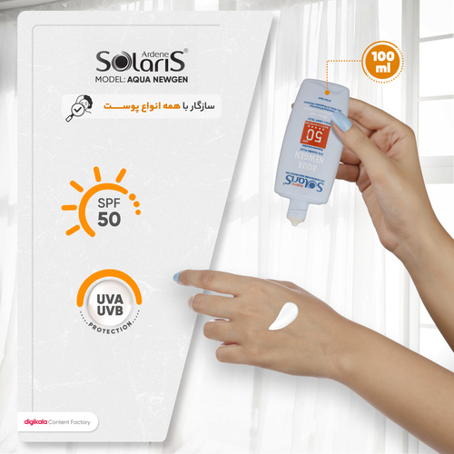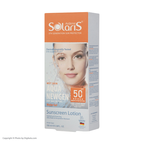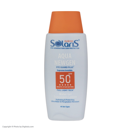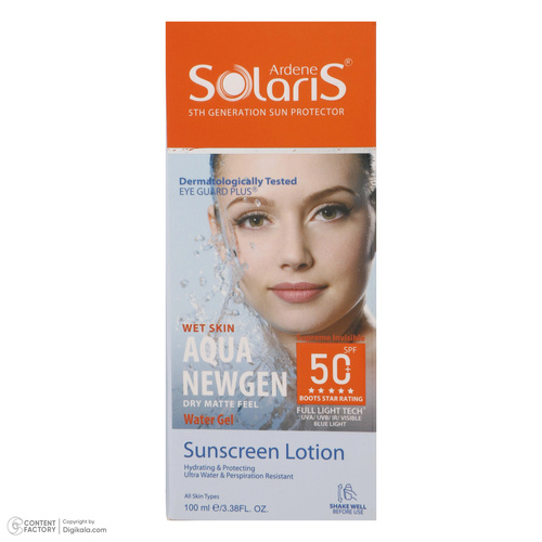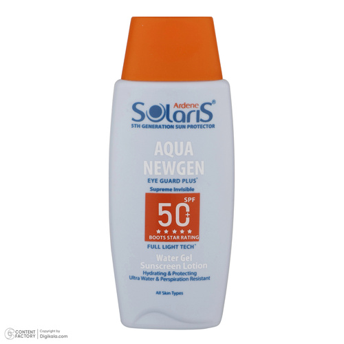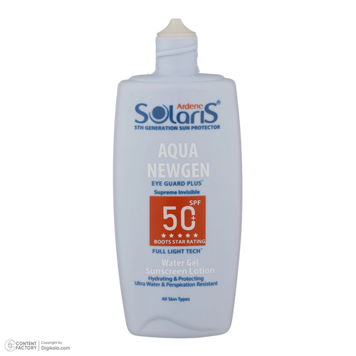 لوسیون ضد آفتاب بدون رنگ آردن سولاریس SPF50 مدل AQUA NEWGEN محافظ UVA ،UVB، ضد آب، مناسب انواع پوست حجم 100 میلی‌لیتر