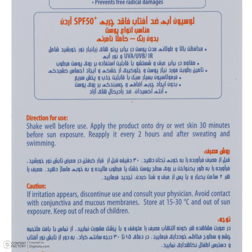 لوسیون ضدآفتاب آردن سولاریس با ویژگی‌های سازگار با محیط زیست، انتخابی هوشمندانه برای کسانی است که به دنبال حفاظت کامل از پوست خود هستند، در حالی که به حیوانات و طبیعت احترام می‌گذارند. این محصول با فرمولاسیون بدون تست حیوانی، فاقد پارابن و سیلیکون، تعهد خود به پایداری محیط زیست را به نمایش می‌گذارد. با SPF 50، این لوسیون به طور موثری از پوست شما در برابر اشعه‌های مضر UVA و UVB محافظت می‌کند. با ماندگاری دو ساعته و ویژگی ضد آب، لوسیون آردن سولاریس انتخابی ایده‌آل برای استفاده در شرایط مختلف آب و هوایی است. این محصول با حجم 100 میلی‌لیتر، مناسب برای استفاده روی صورت، گردن و بدن بوده و به دلیل بافت بدون رنگ و فاقد چربی، برای همه انواع پوست قابل استفاده است. لوسیون آردن سولاریس با ترکیباتی که فاقد مواد مضر هستند، به حفظ سلامتی و زیبایی پوست شما کمک می‌کند. با انتخاب لوسیون ضدآفتاب آردن سولاریس، نه تنها از پوست خود در برابر اشعه‌های مضر محافظت می‌کنید، بلکه به حفظ محیط زیست نیز کمک می‌کنید. همین حالا این لوسیون را امتحان کنید و از تجربه‌ای مطمئن و سازگار با طبیعت لذت ببرید.
